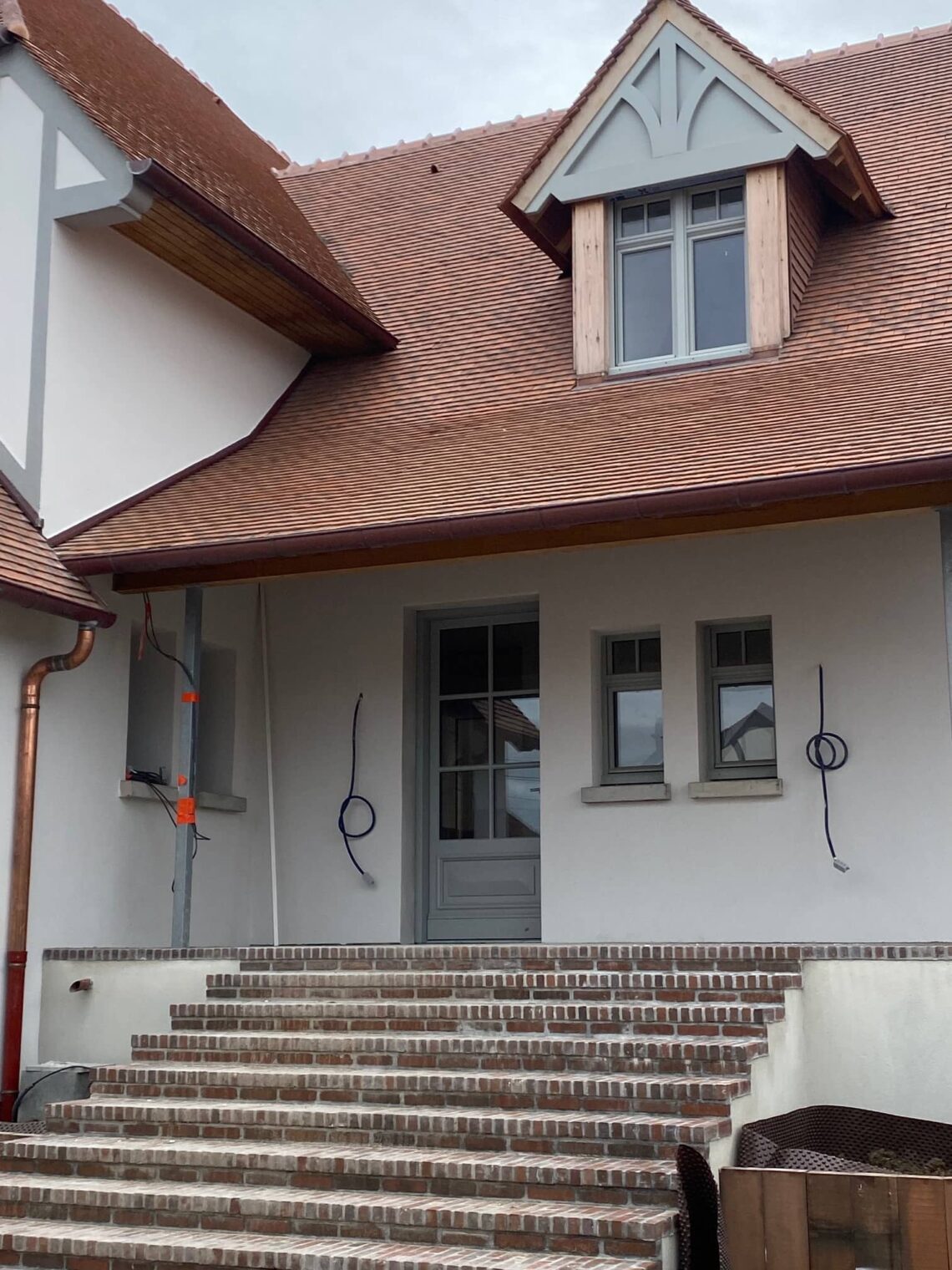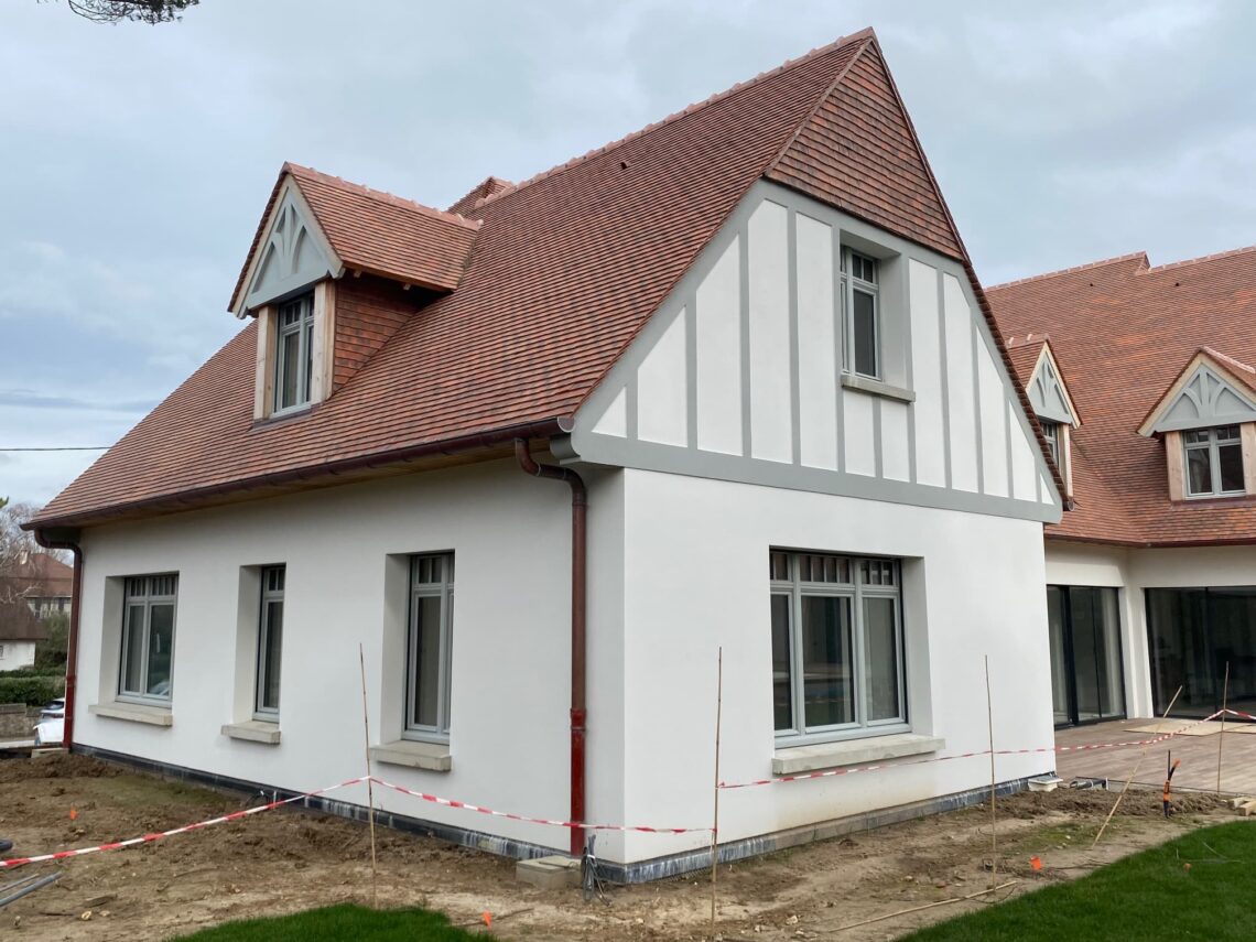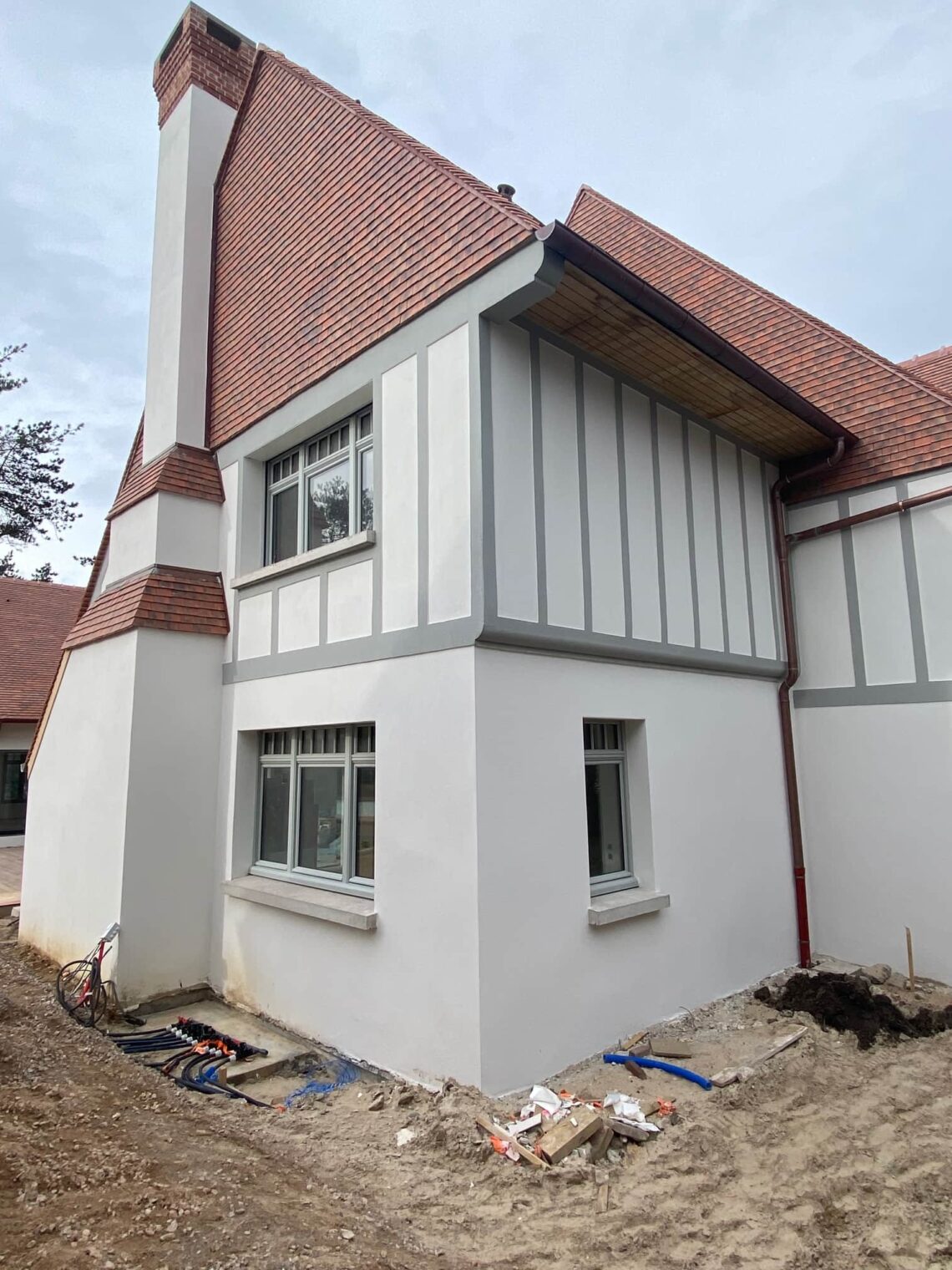 Sur ce superbe chantier d’enduit de façade au Touquet, nos équipes ont pu montrer tout leur savoir-faire. Un bel ensemble constitué d’une partie neuve et d’une partie en rénovation sur lesquelles ont été appliqués des enduits de marque VPI Monocal GF et Rénopass Chaux en taloché fin. Et parce que la Normandie n’est pas bien loin, nos façadiers ont réalisé des imitations de colombages à base d’enduit. Cette matière minérale permet en effet de réaliser des modénatures pour donner du caractère à vos façades. On peut ainsi laisser libre court à ses envies en réalisant des changements de couleur, des surépaisseurs, des joints creux ou autres imitations pierre.